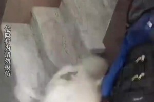 工人维修电梯小狗凑上前,不承想下一秒小狗就直接跳下电梯井