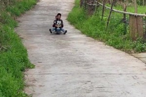 两名男孩骑扭扭车下坡,不料刹不住车,两个人双双摔倒