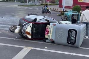 三辆三轮车路上相撞,男子从车里奋力爬出,网友:一定要注意安全